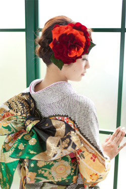 レトロな着物に合わせて、少し大人っぽいヘアメイクに。個性的な髪飾りは、モデルさんがお花屋さんでオーダーメイドしたもの。ブリザードフラワーで出来た1点物。こだわりが詰まっています。